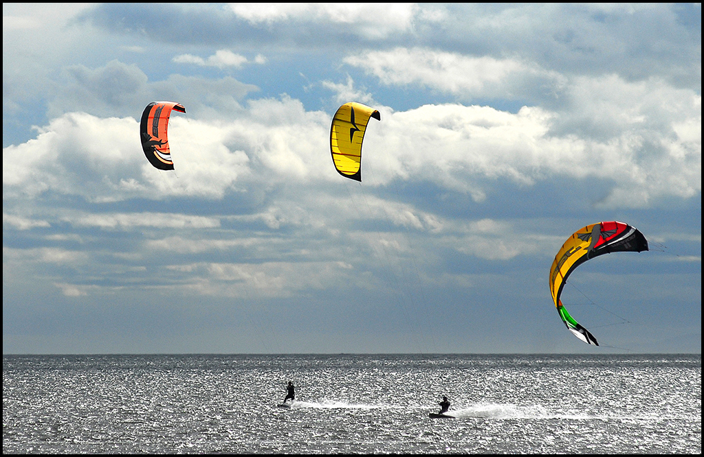 Kite board sails filled with high winds on Saturday, October 4, pull boarders across the surface and some times high above Boundary Bay with ballet-like grace against dramatic skies.