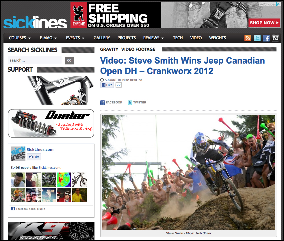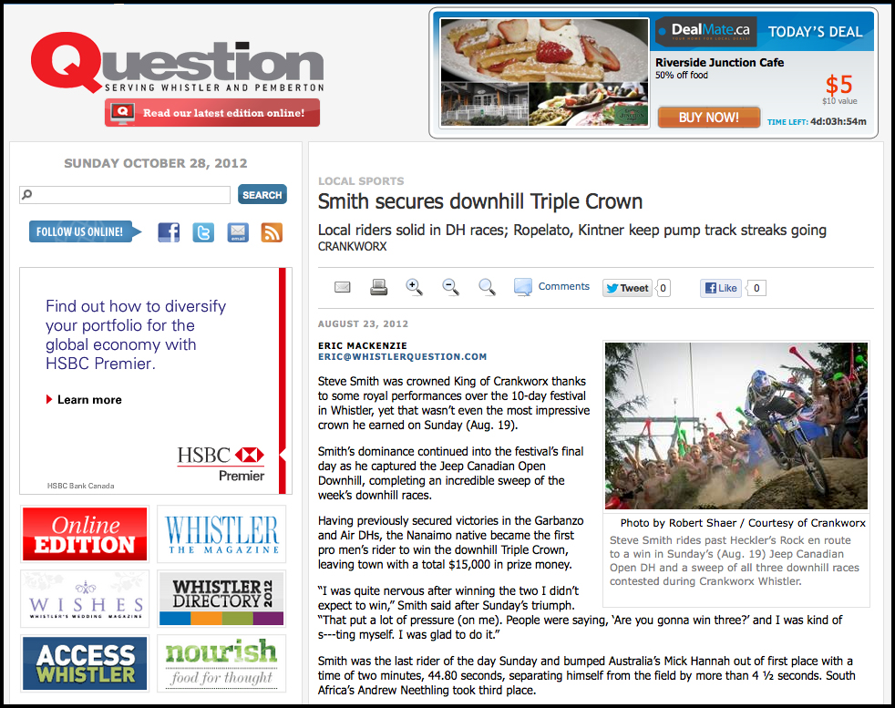In the days that followed Smith’s winning run, this image appeared on Facebook, in print and on a dozen different web outlets, some are included below. The exciting thing for me is though my week in Whistler for Crankworx had been a total gamble I saw my photos sent out to the Mountain Bike community world wide, especially cool since is Mountain Biking is among my favourite things to shoot, but also something I consider to be a weak link in my portfolio of experience. Now, almost a year later, this image still has legs and has recently appeared a travel magazine, with permission and attribution, destined for thousands of hotel rooms in Whistler.