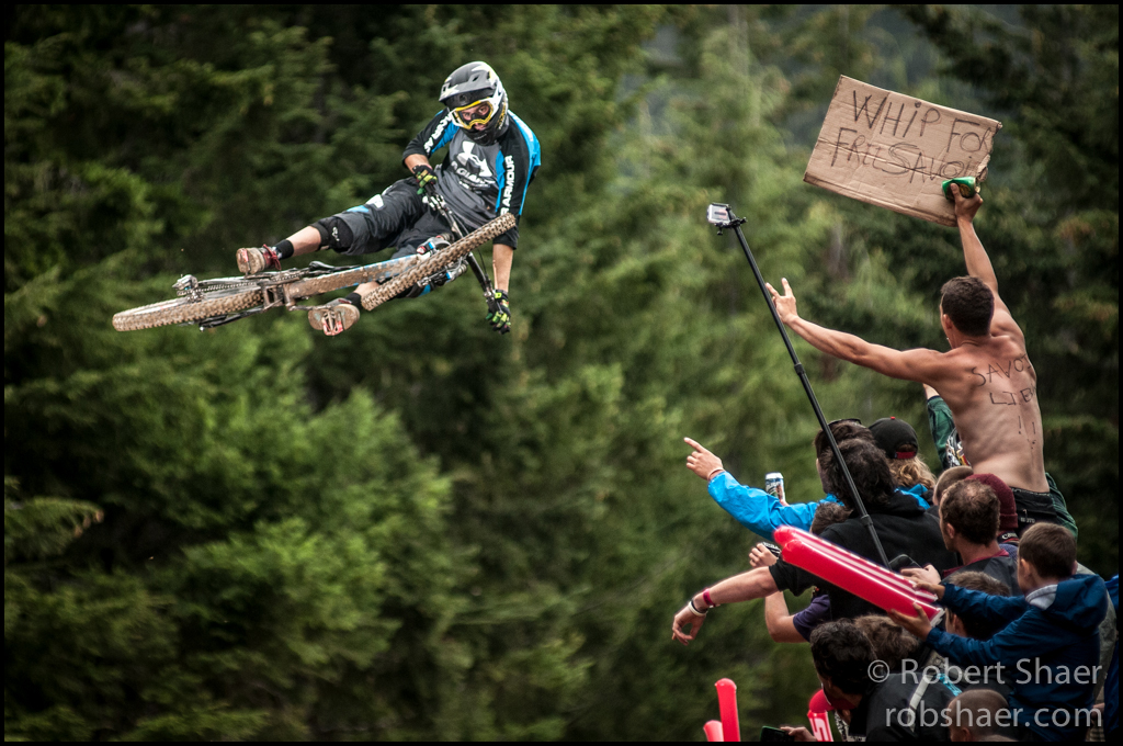 Today’s images are from the Whip Off contest on Crabapple Hits just below mid mountain. The Whip Off must be among the most exciting Crankworx events to photograph. The quarters are small, the airs huge and the crowds are very enthusiastic. There were no shortages of close calls for photographers and spectators alike, and I even managed to catch a tumbling bike and rider.
