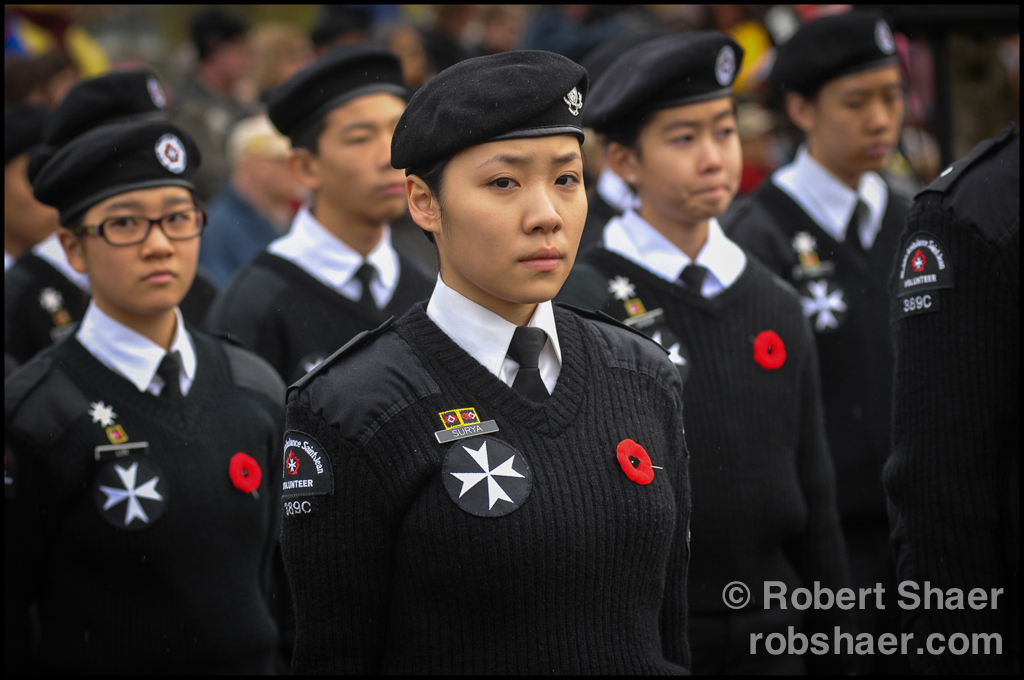 Members of the St John Ambulance Volunteer Corps stand at ease during Remembrance Day ceremonies at Confederation Park.